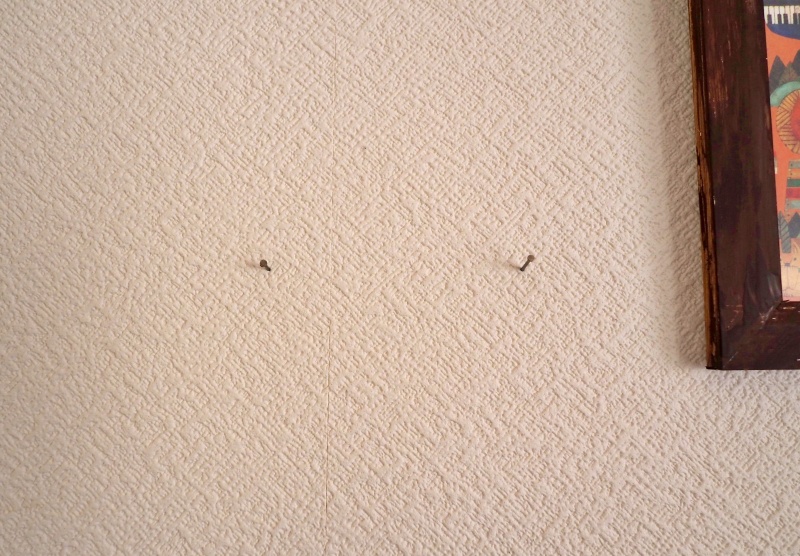 フックにフレームを掛けてもいいんですが、ピンだけの方がピンを刺す数が少なくて済むのと、フレームと壁のすき間ができないのでスッキリします。