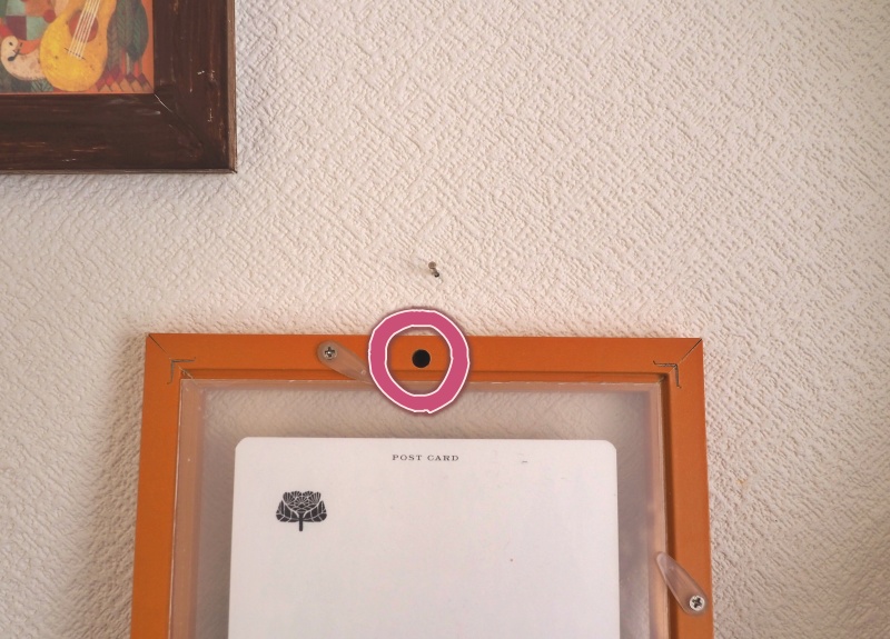 フレームの裏のちょうど良さそうなところに穴があれば、そこにピンをかけるし、なければフレームにホッチキス等で紐をとめて、その紐にピンを引っかけます。